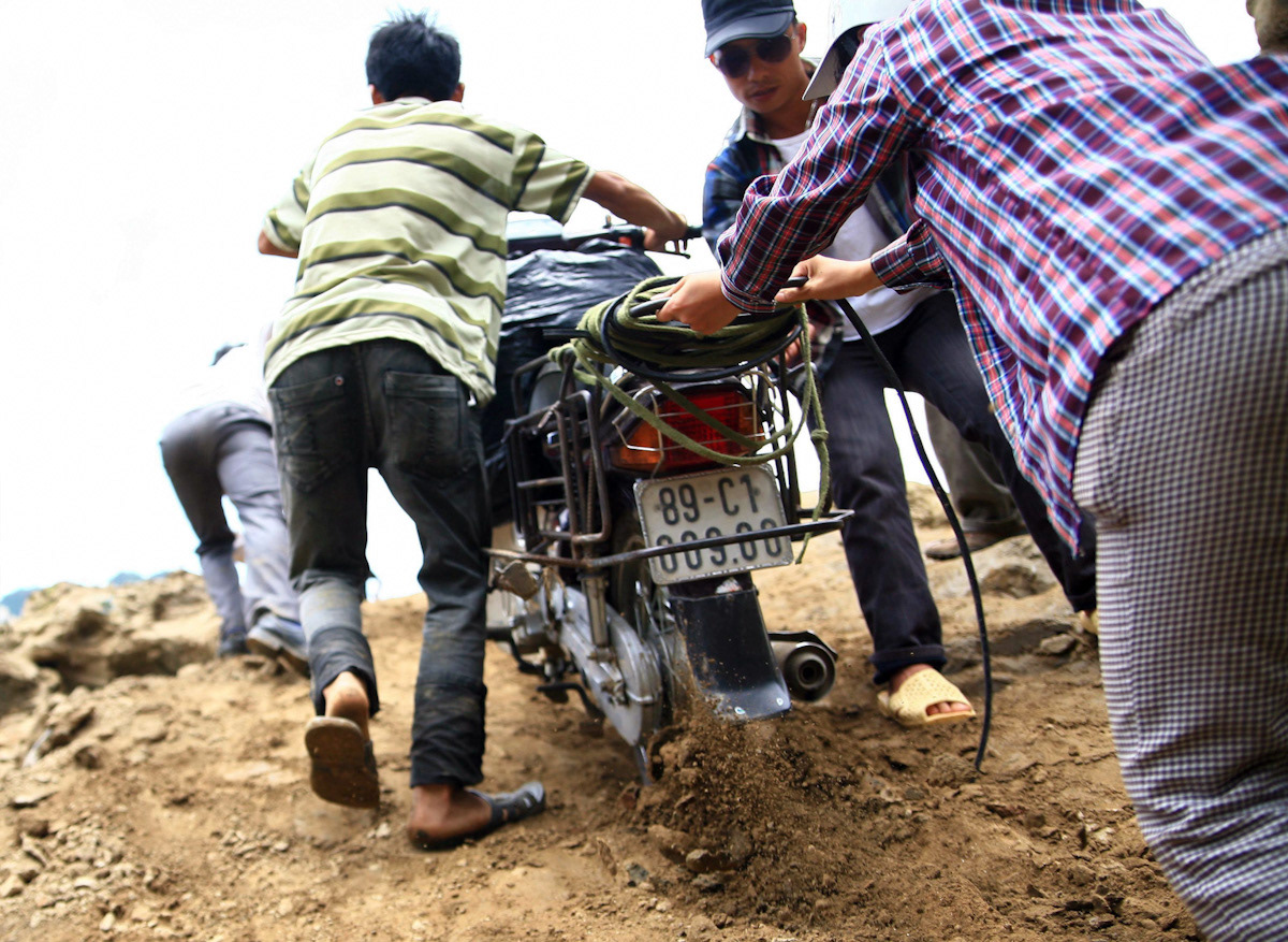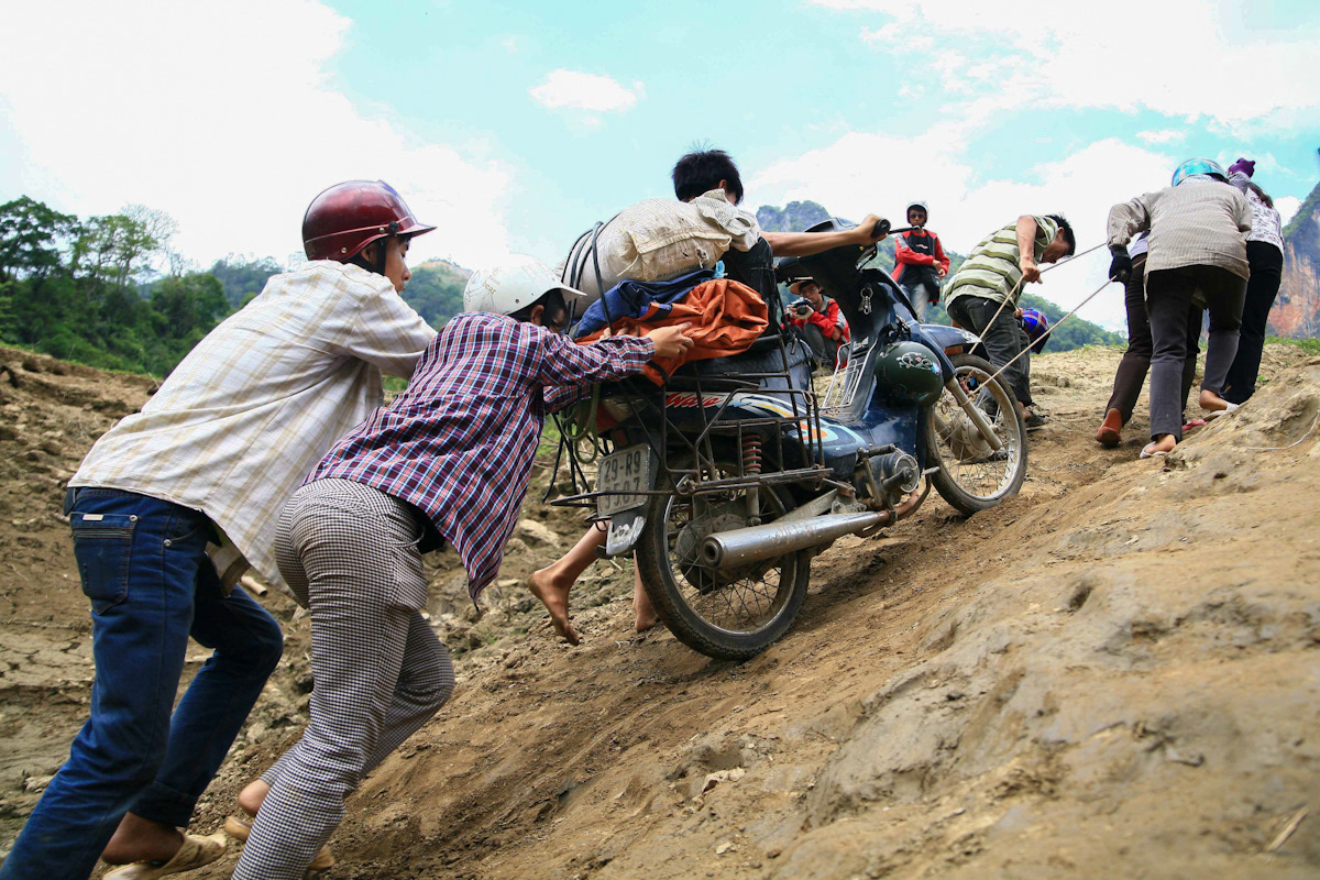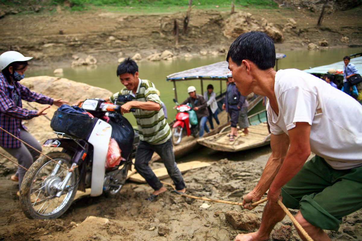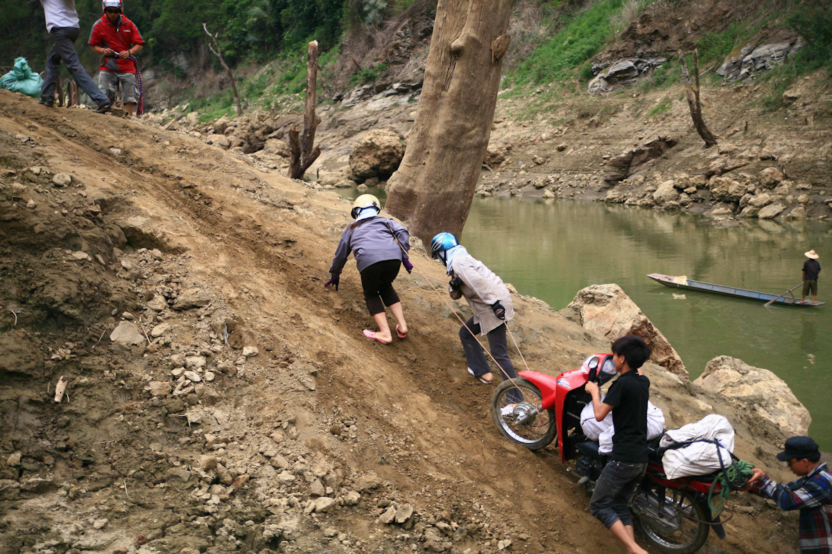 at the rural river crossing, villagers join forces to push vehicles from the ferry up the steep riverbank.